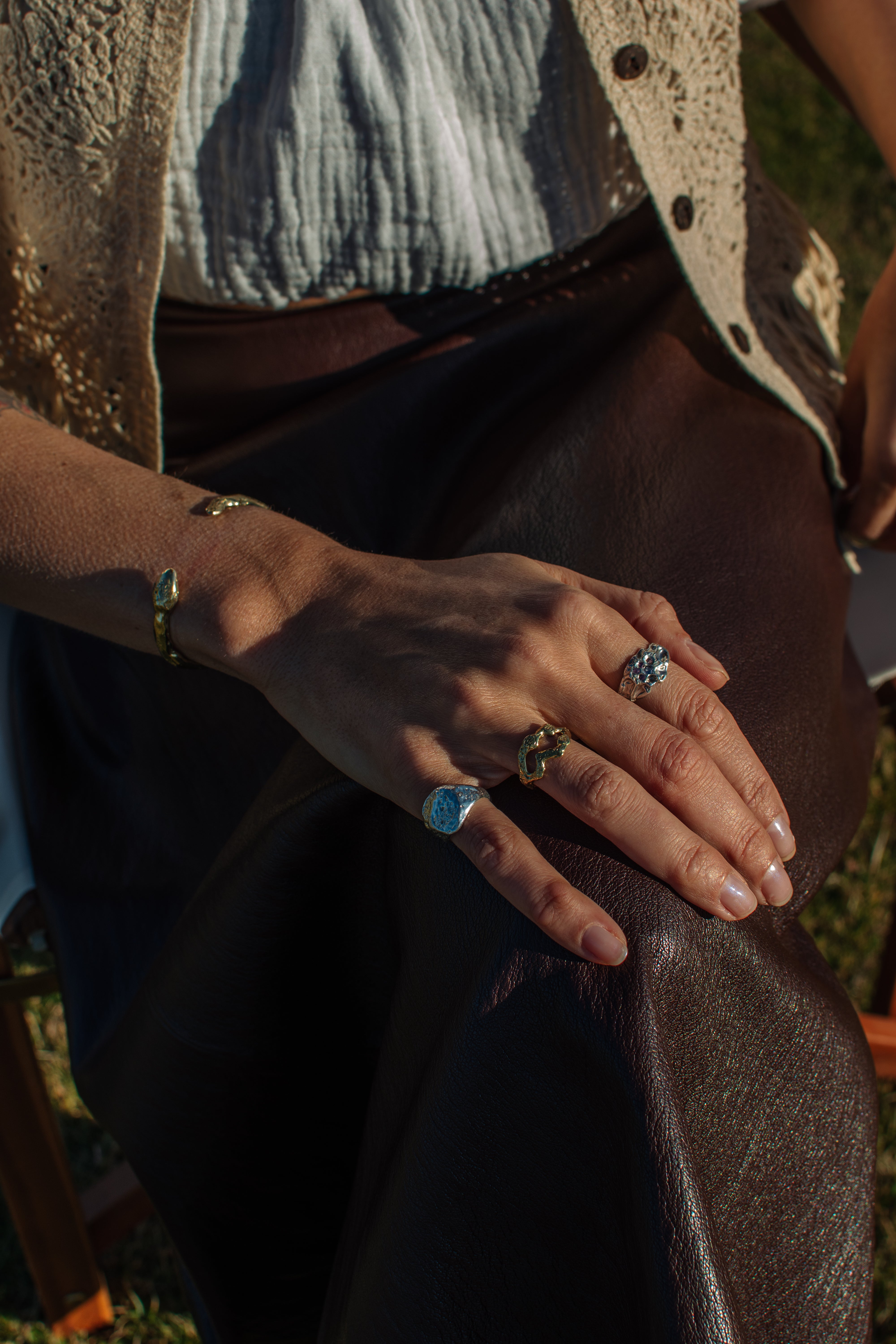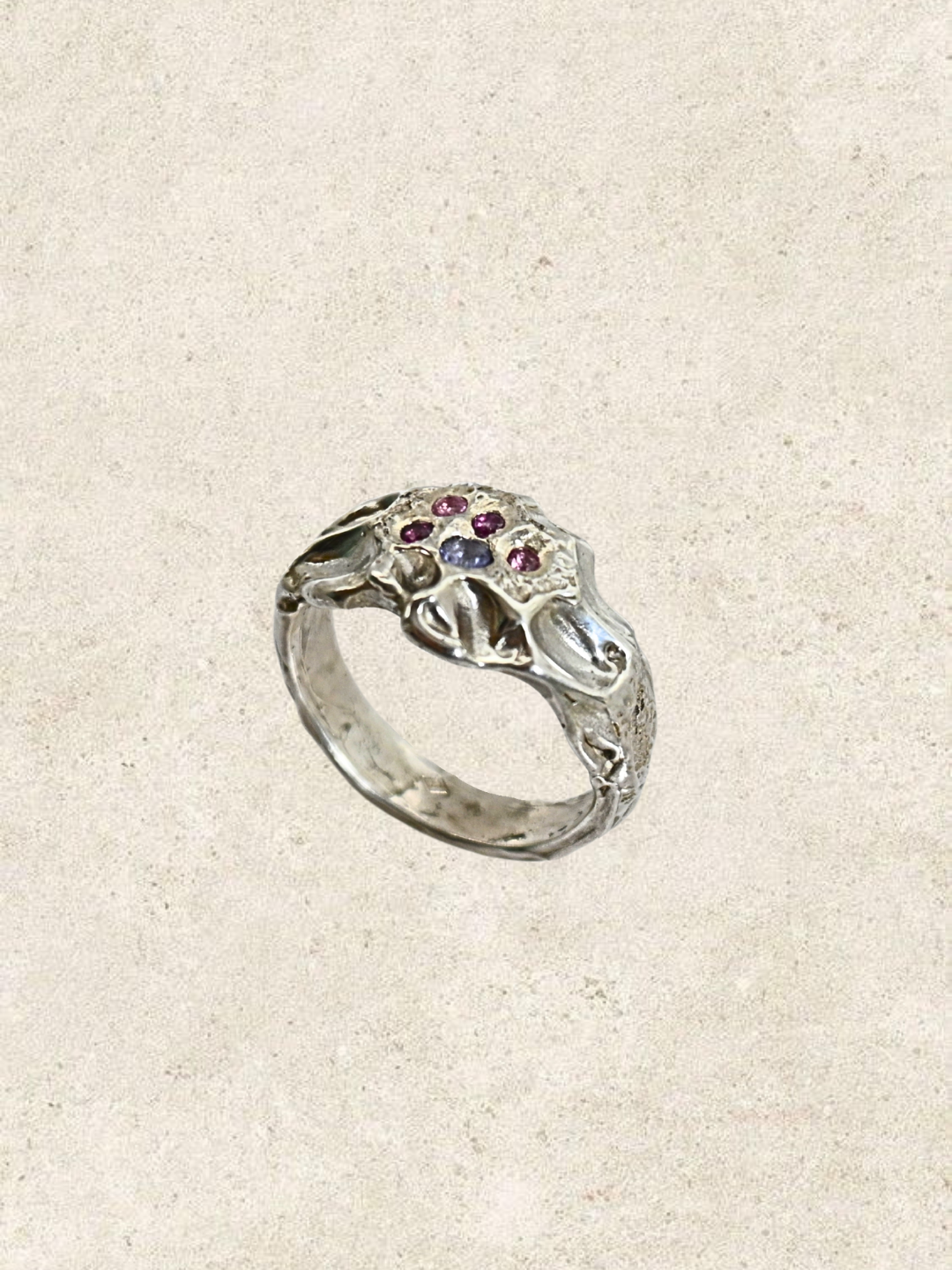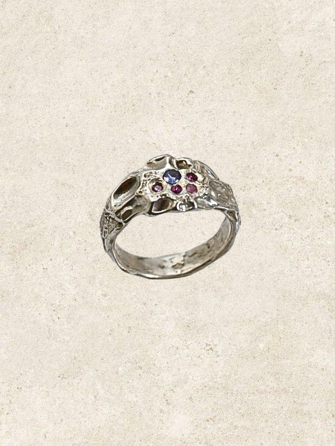 La bague Collapse, une forme dense, presque archaïque. La texture organique évoque la roche volcanique marquée de cratères avec l’impact, une matière qui a vécu, transformée par le temps et l’univers. La surface rocheuse accueille des saphirs roses et tanzanites, comme des éclats laissés par l’explosion.