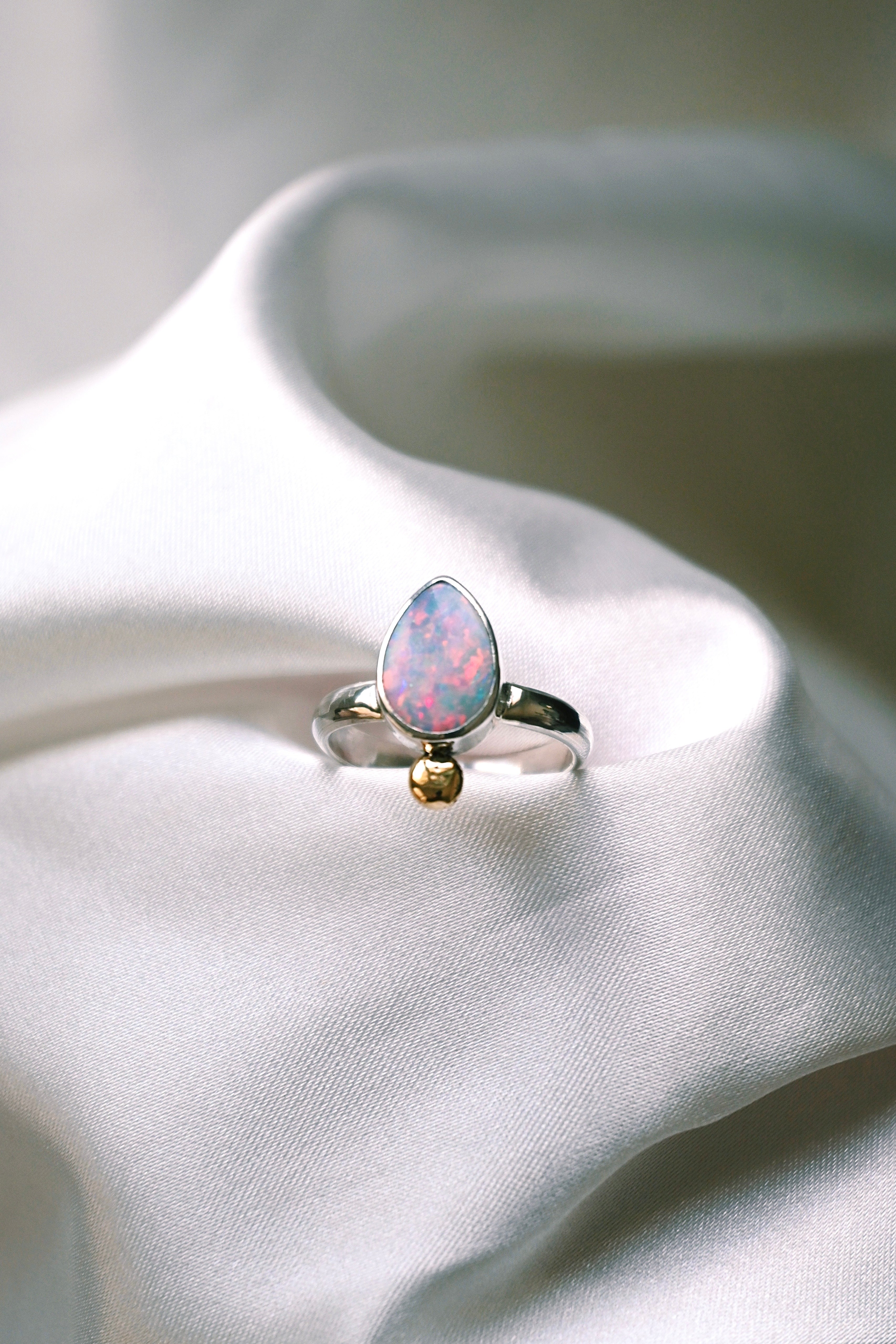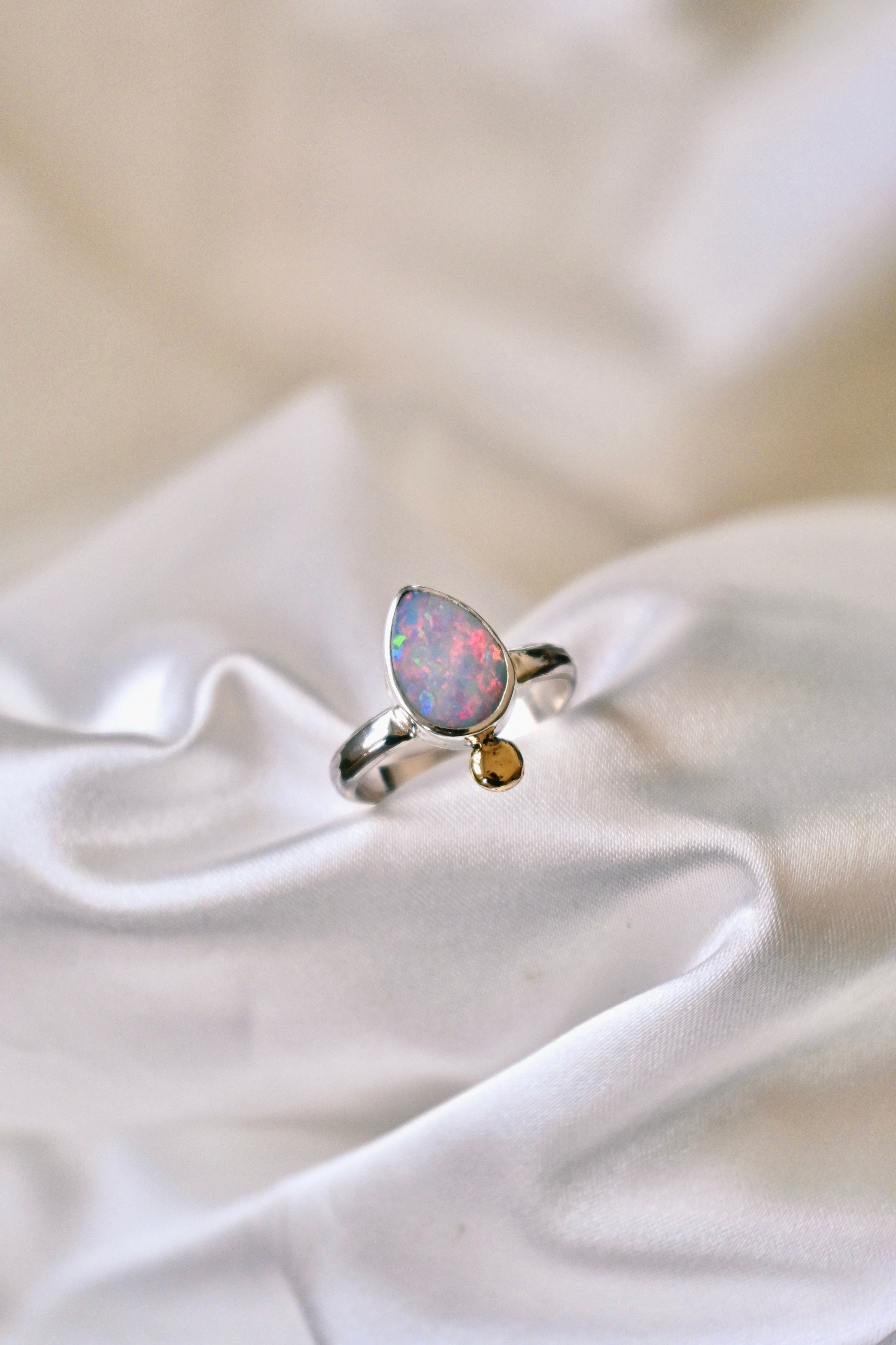 Une belle bague aux couleurs galaxie grâce à sa sublime Opale d’Australie irisée.