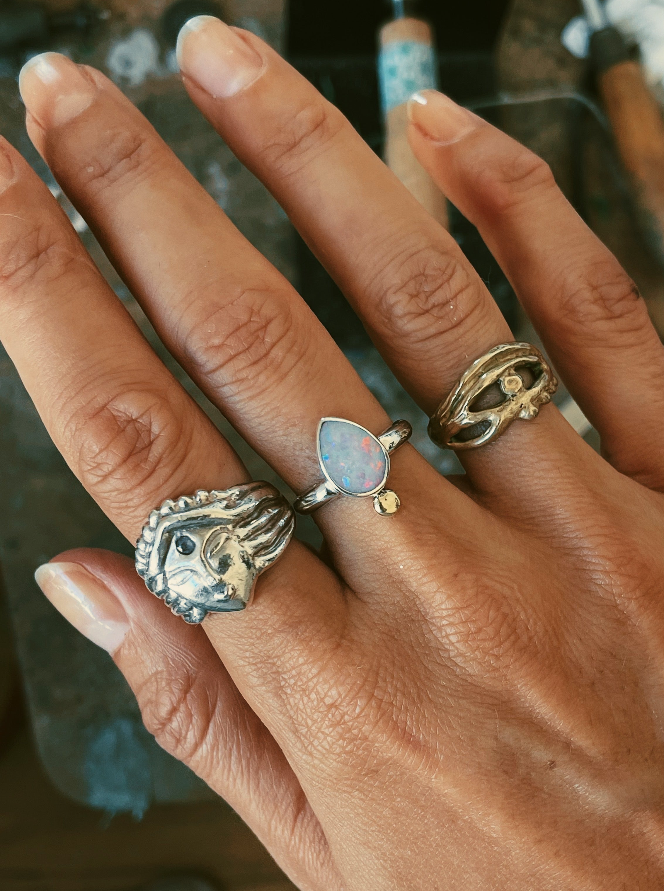Fabriquée entièrement à la main en argent 925, et sa petite perle plate en laiton. Pièce unique en taille 54.