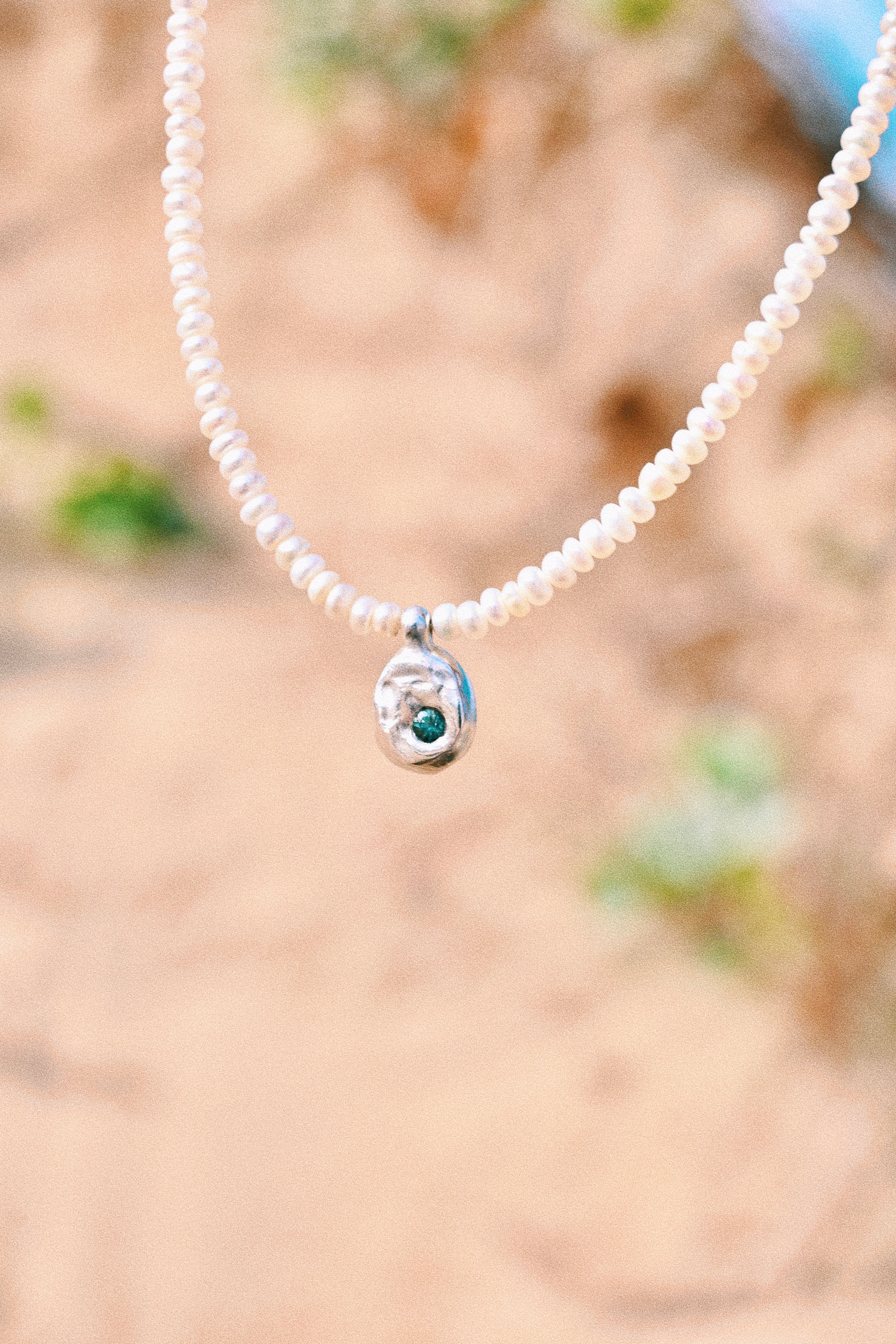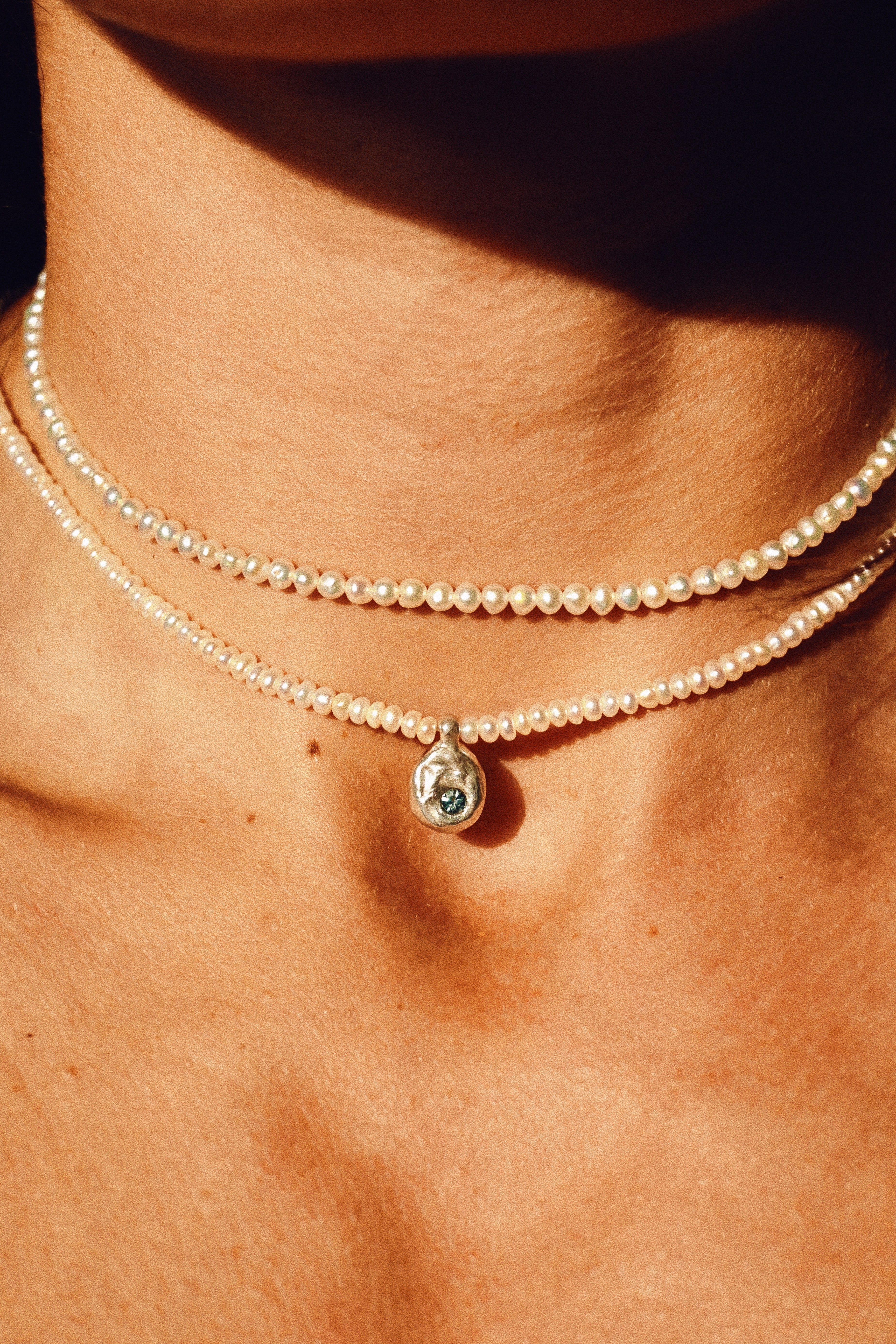 Perlae unit la douceur des perles d’eau douce à la force d’une pierre précieuse, enchâssée dans l’argent. C’est le collier talisman de la collection capsule, qui relie les profondeurs marines à la clarté céleste. Le pendentif attrape le soleil comme une goutte d’eau dans l’océan.